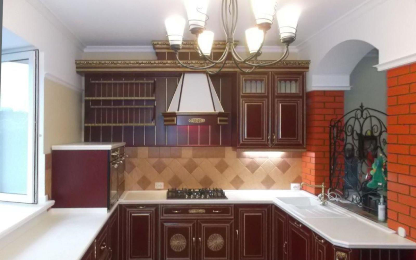 • Классический. Благородный бордовый цвет – нетрадиционное решение для фасадов мебели, но оно позволит подчеркнуть эксклюзивность интерьера. Для оформления пространства можно выбрать гарнитур из МДФ с покрытием шпоном, лаком, эмалью, с резной отделкой. Оттенки бордового можно использовать в оформлении окон, кухонном текстиле, мягкой обивке стульев и др. Столешницу на кухне лучше сделать белого или молочного оттенка.